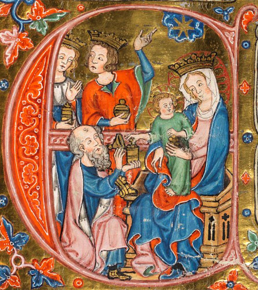 The illuminated manuscript folio past the Willenhalm Chief contains the "Admiration of the Magi" (1330-35) within the alphabetic character a . Mary, crowned equally a queen, sits on a chair carved with Gothic pointed arches and rosettes. The eldest King offering Jesus gold, which He accepts and passes to Mary. Gold was a souvenir the Holy Family could use in their sojourn in Egypt. The middle-aged and young Kings stand backside an altar rail equally if they were in a church building. The middle-aged male monarch's gift is frankincense that would help dissipate the smell of the stable. The young king's gift is myrrh, a consecrated incense used for anointing priests and kings. The middle-anile King points to the seven-pointed star, symbol of the seven days of creation. The star also was thought to ward off evil.